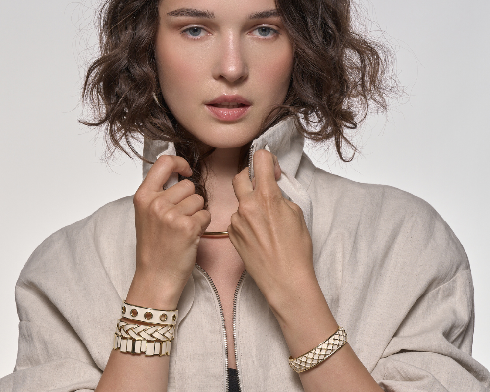 Bijoux singuliers, ils se caractérisent par leur design maison épuré, par leurs motifs cloisonnés ainsi que par leurs imprimés identitaires déclinés dans plusieurs coloris. Joyeusement modulables, ils s’articulent à travers une diversification de portés baptisée : le up-wear ou s’expriment librement en solo.