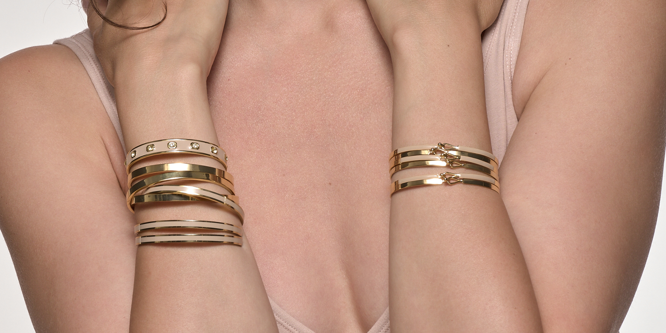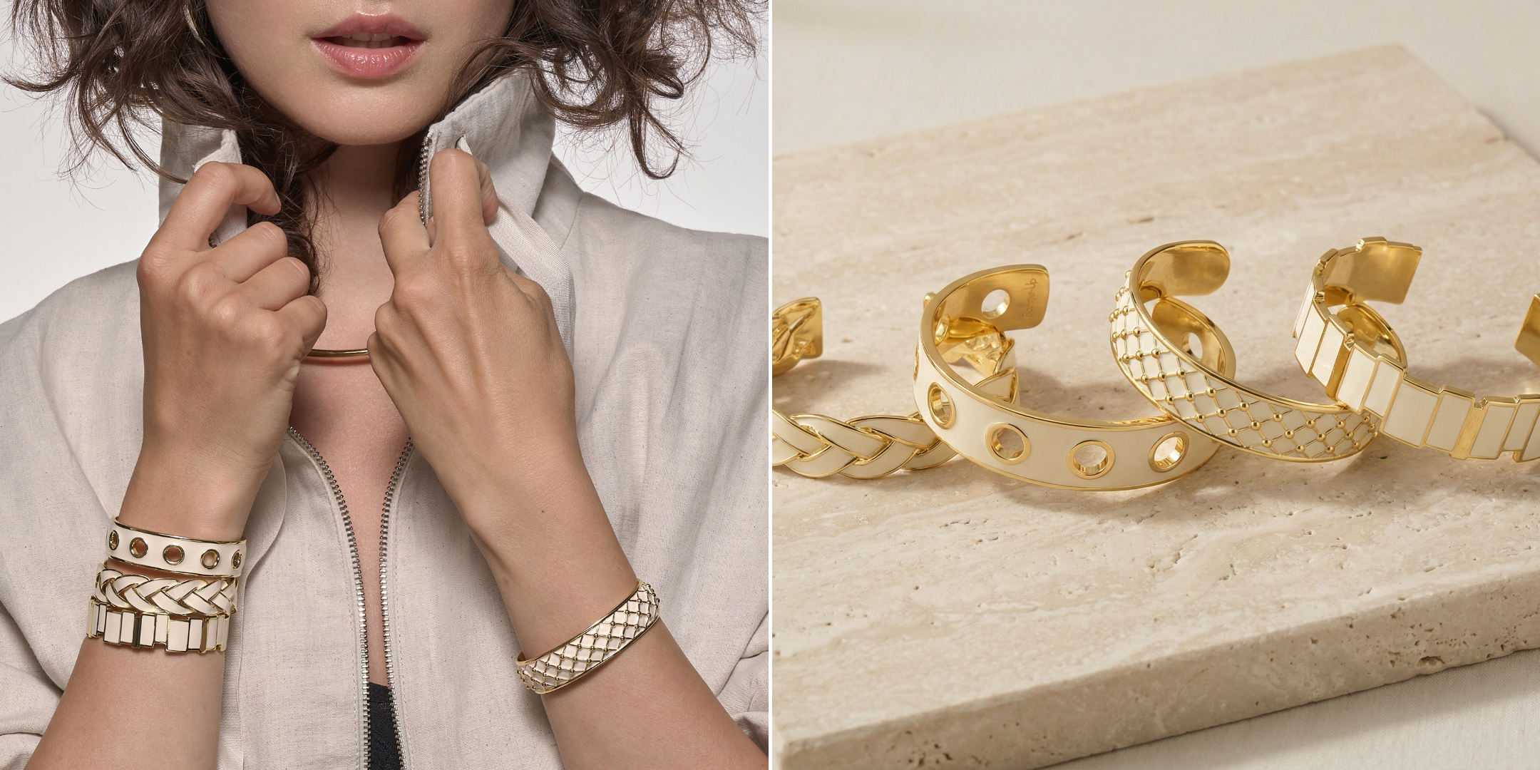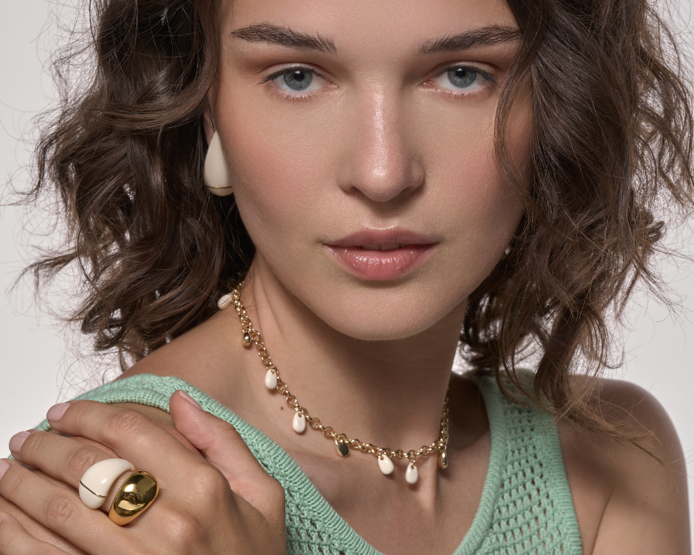 Bijoux singuliers, ils se caractérisent par leur design maison épuré, par leurs motifs cloisonnés ainsi que par leurs imprimés identitaires déclinés dans plusieurs coloris. Joyeusement modulables, ils s’articulent à travers une diversification de portés baptisée : le up-wear ou s’expriment librement en solo.