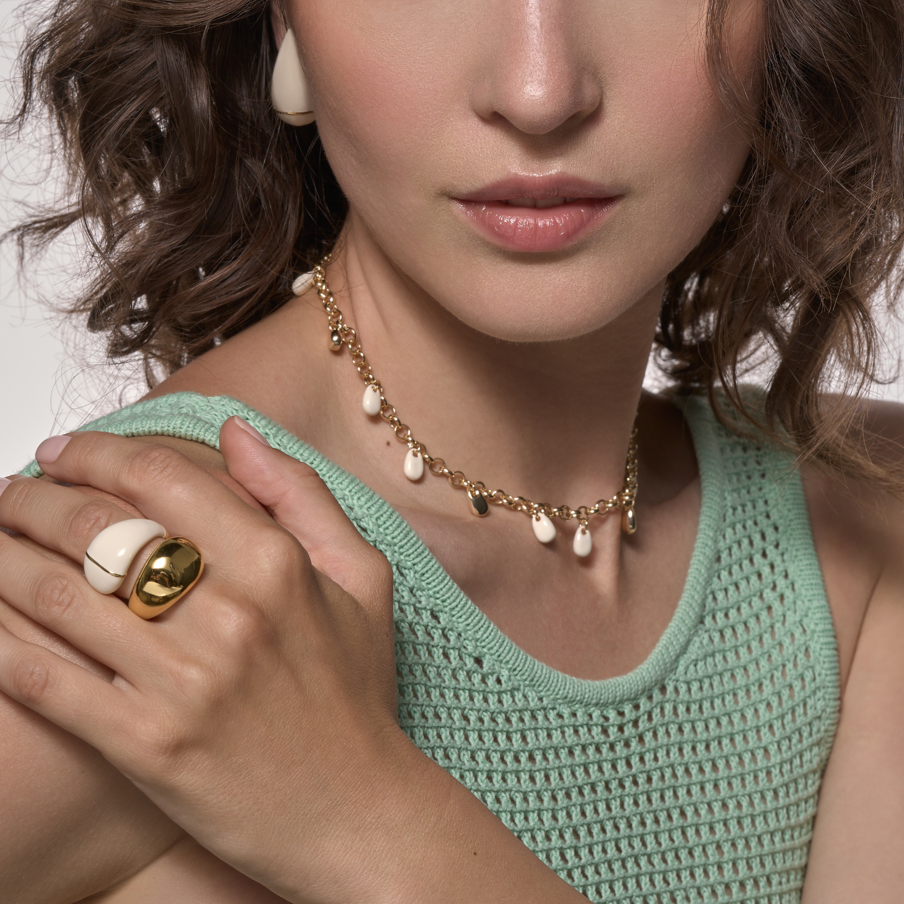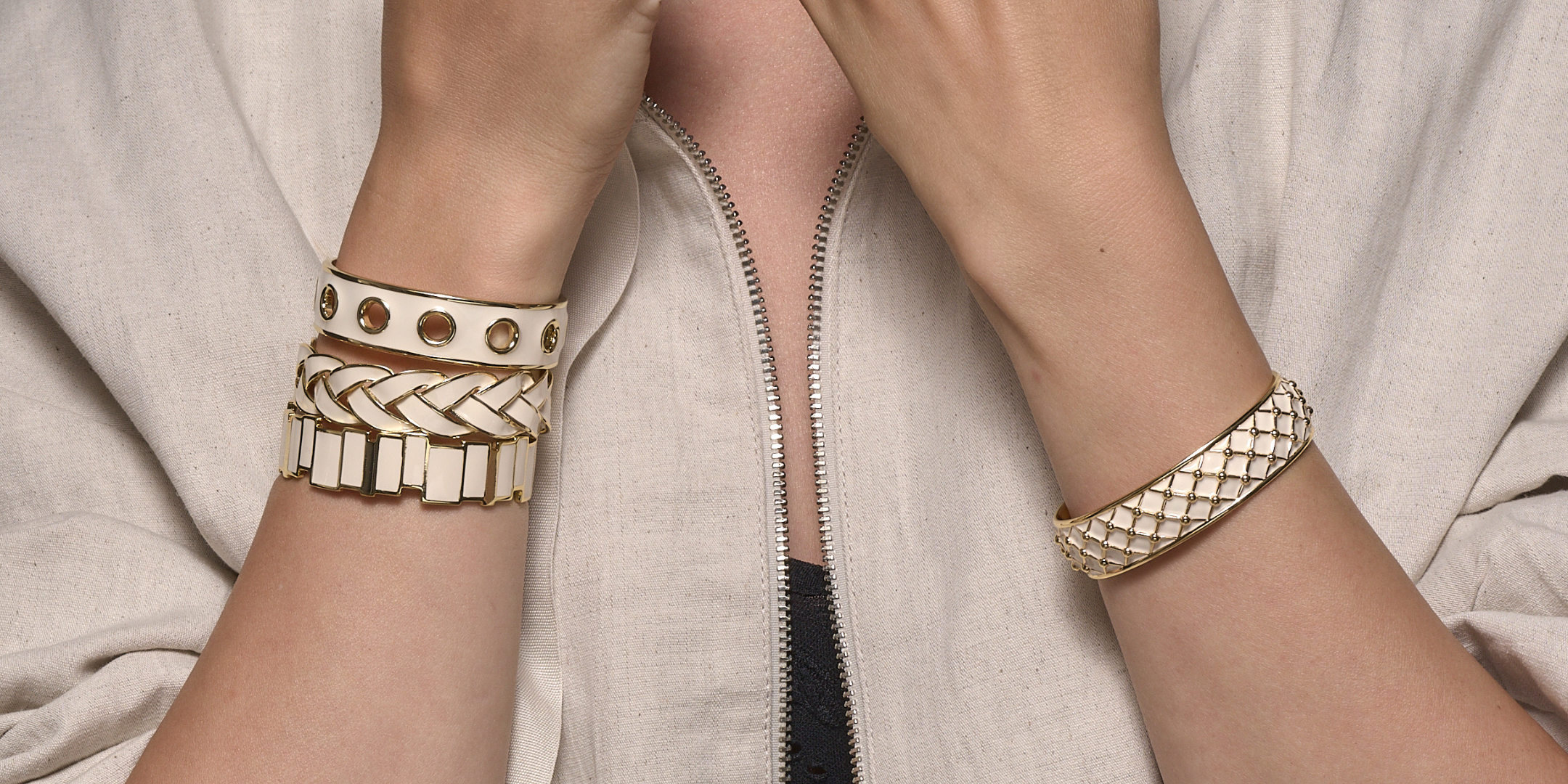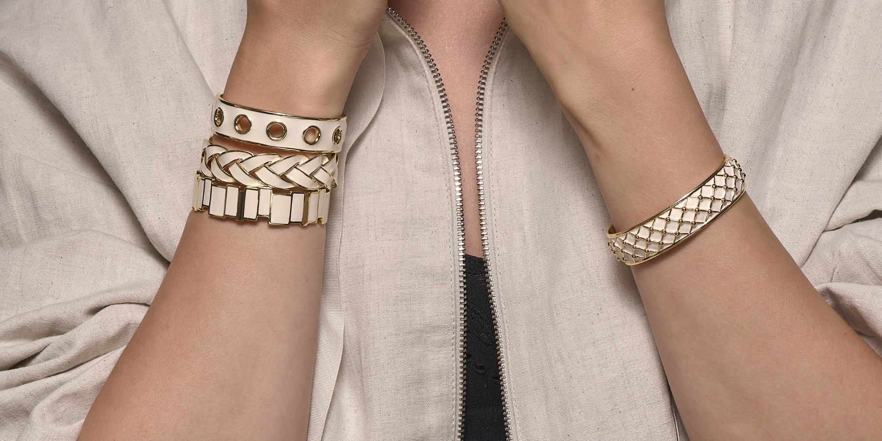 Bijoux singuliers, ils se caractérisent par leur design maison épuré, par leurs motifs cloisonnés ainsi que par leurs imprimés identitaires déclinés dans plusieurs coloris. Joyeusement modulables, ils s’articulent à travers une diversification de portés baptisée : le up-wear ou s’expriment librement en solo.