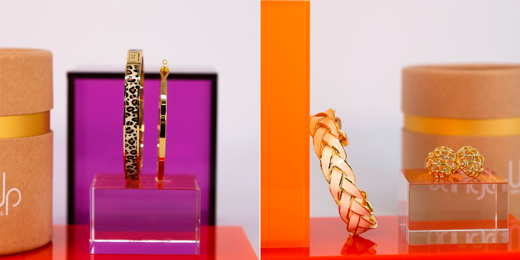Bijoux singuliers, ils se caractérisent par leur design maison épuré, par leurs motifs cloisonnés ainsi que par leurs imprimés identitaires déclinés dans plusieurs coloris. Joyeusement modulables, ils s’articulent à travers une diversification de portés baptisée : le up-wear ou s’expriment librement en solo.