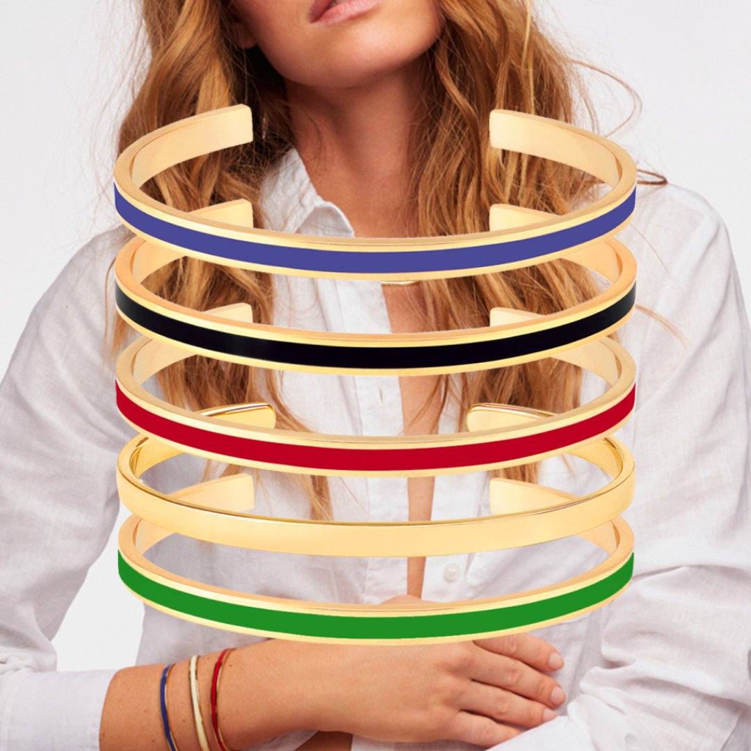 Bleu, or, noir, vert, rouge, partez ! Pour célébrer l’effervescence sportive à Paris, nos Bangles s’accumulent joyeusement aux couleurs du logo des JO. L’élégance athlétique en un tour de poignet !