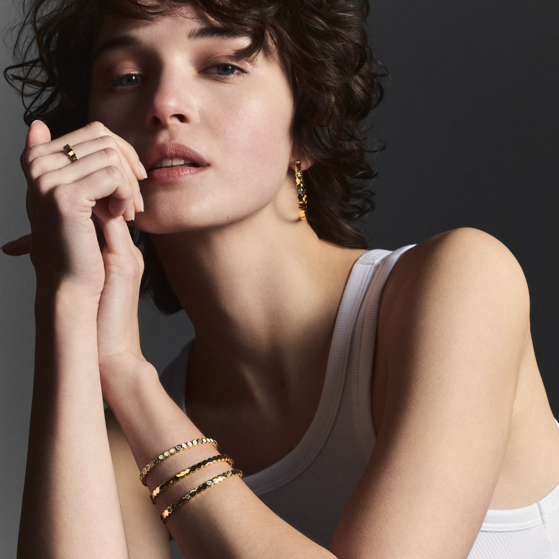 Chez Bangle-Up, tout se métamorphose cette saison, l'imprimé Peony (Pivoine) éclot en manchette ainsi qu'en pendentif et broche "fleur" en 3D. La ligne Lumi s'illumine d'oxyde de zirconium. Et, le symbole emblématique B.Heart devient un bijou à part entière.