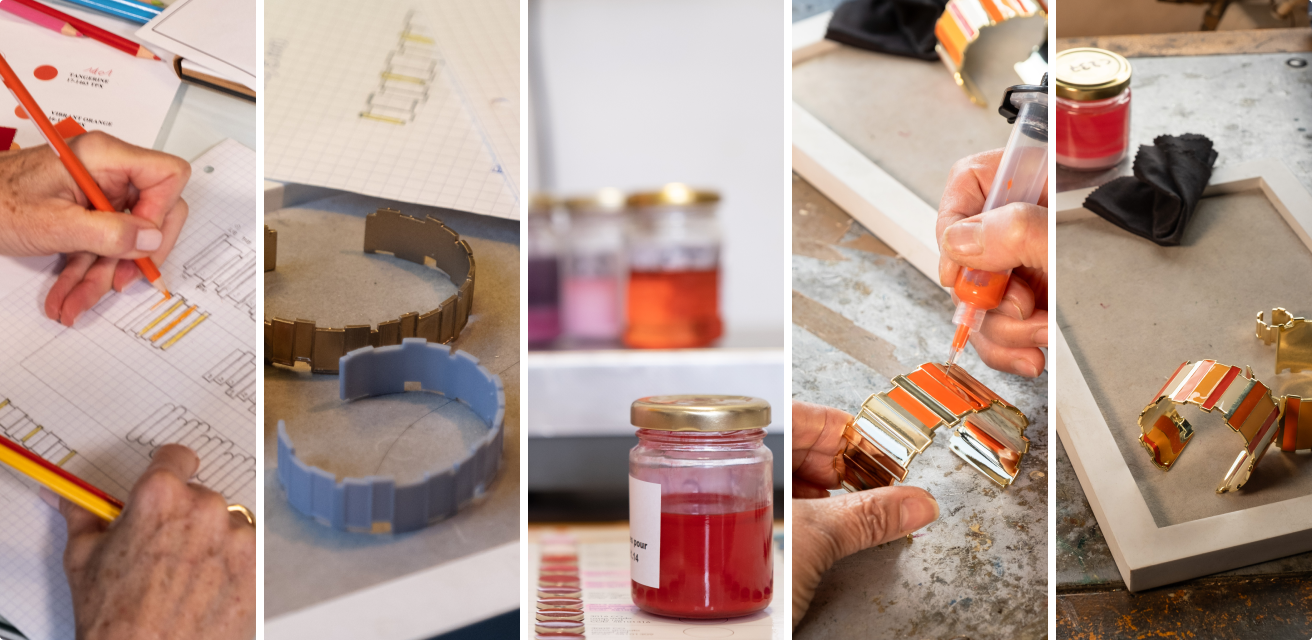 Brass jewelry, enhanced with fine gold, Bangle-Up's creations are the result of the artisanal process of lacquer and enamel in epoxy resin. They are shaped, developed and produced in 3D in a workshop that has its own factory in Paris. The pieces are then produced by a dedicated partner in Asia where the know-how of the hand is closely linked to industrial engineering.