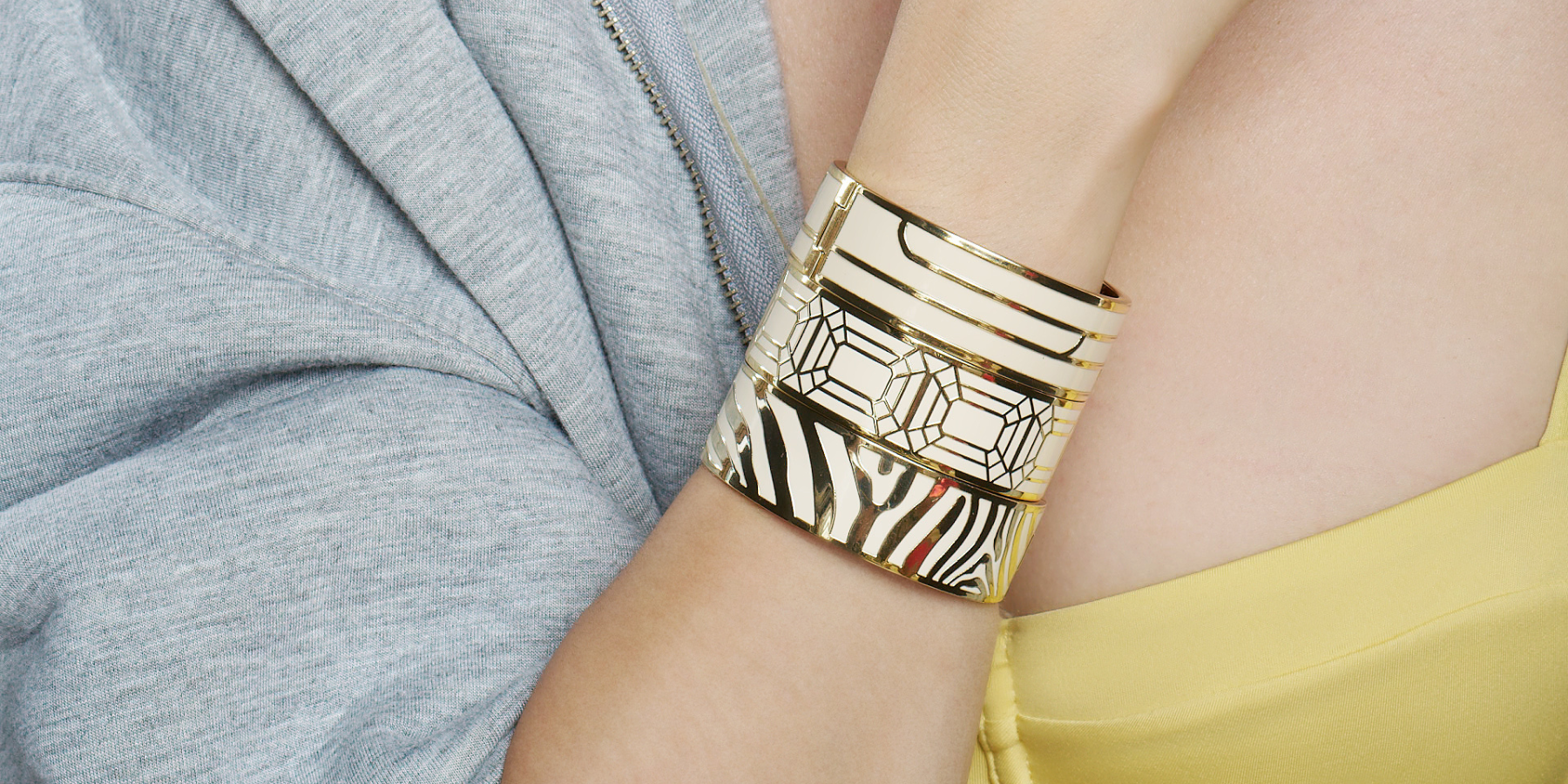 Singular jewelry, they are characterized by their refined in-house design, their cloisonné patterns as well as their signature prints available in several colors. Joyfully modular, they are articulated through a diversification of wear called: up-wear or express themselves freely solo.