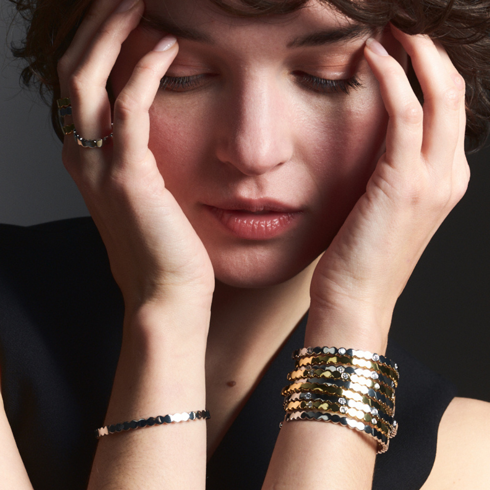 Sobres et raffinés, actuels et intemporels, nos « Bangle » cultivent subtilement l’harmonie des contraires. Bangle-Up s'inspire de la forme originelle du « Bangle » et propose des imprimés colorés. Un « parti-print » qui d’emblée a fait sa singularité́ ! Ce classique, au fil du temps, s’est constamment renouvelé́. Il s’est d’abord réinventé́ à travers des motifs différenciants puis, il s’est progressivement décliné́ en une famille de pièces complémentaires : des joncs, des manchettes, des bagues, des boucles d’oreilles et des colliers.
