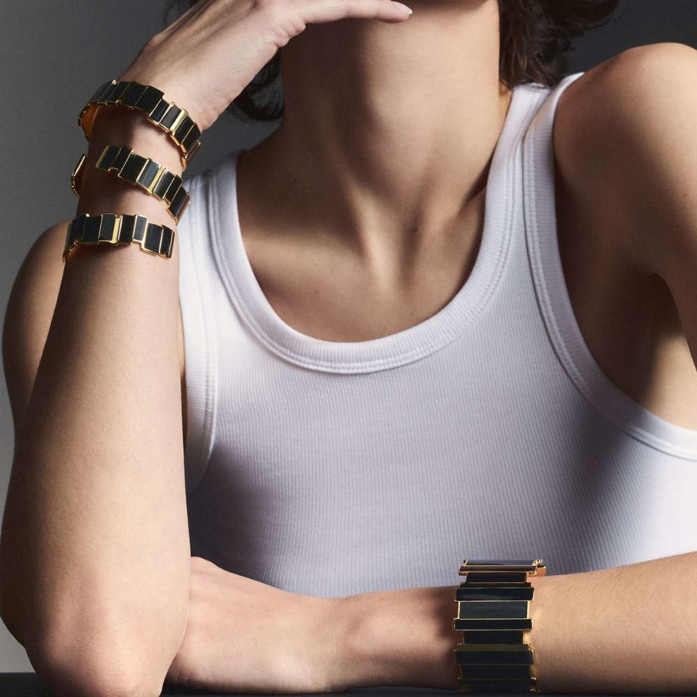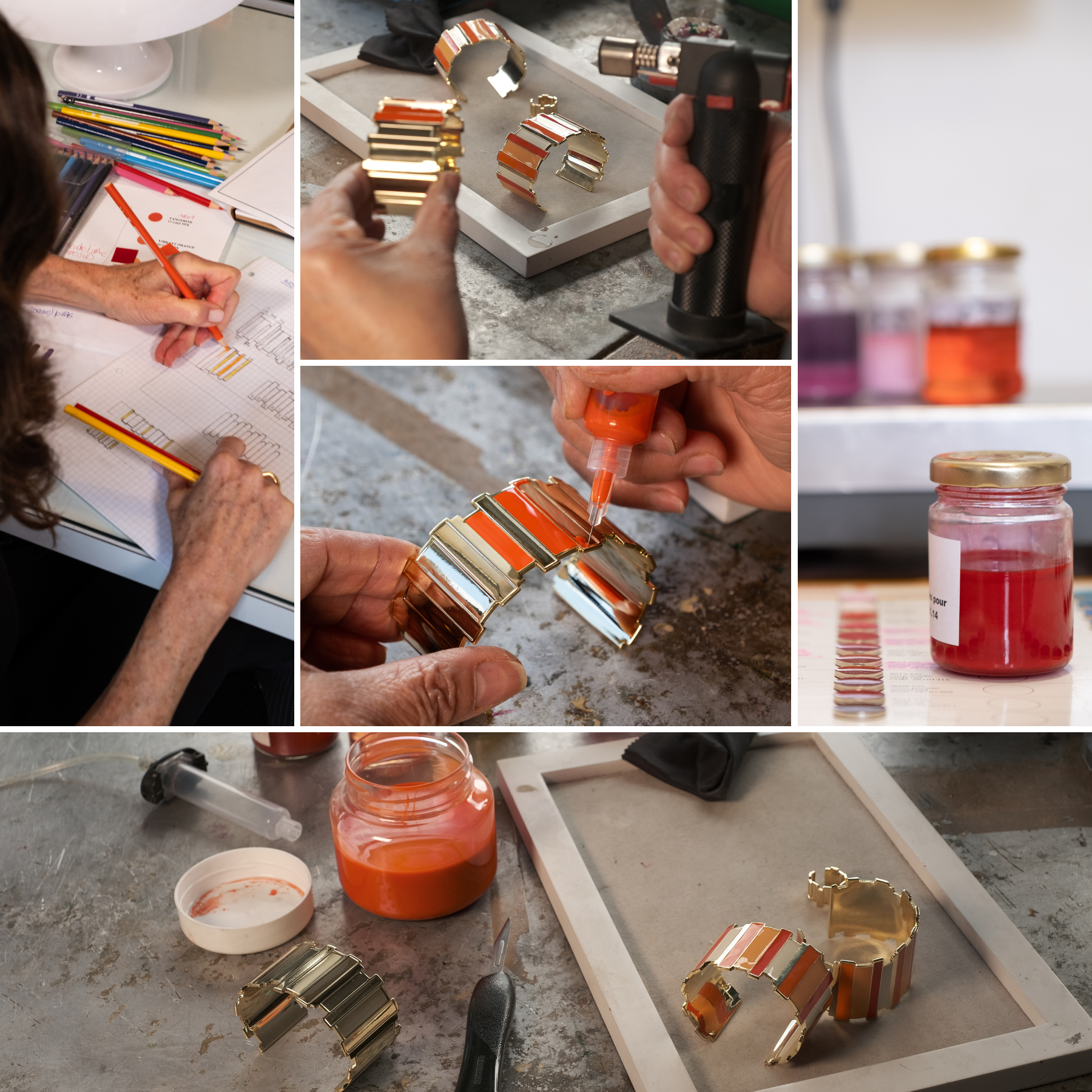 Bijoux de belle facture, rehaussés à l’or fin, les créations de Bangle-Up résultent du processus artisanal revisité de la laque et de l’émail. Un savoir-faire élaboré́ auquel le travail de la main reste intimement lié.